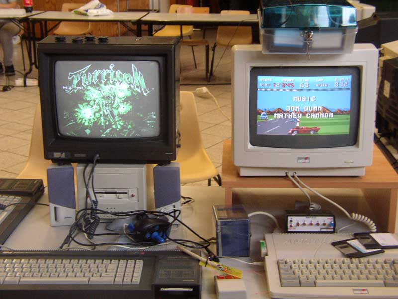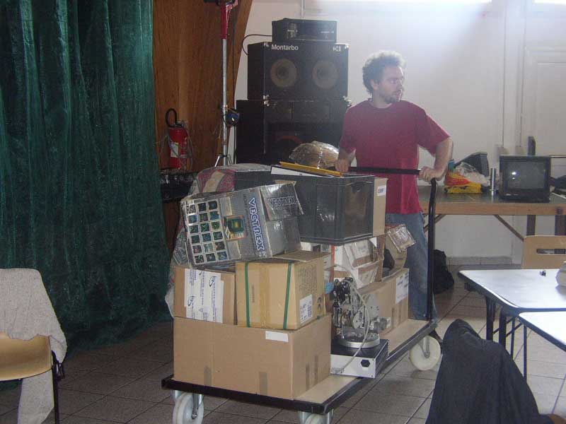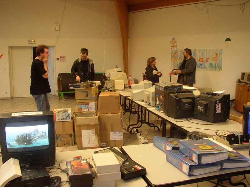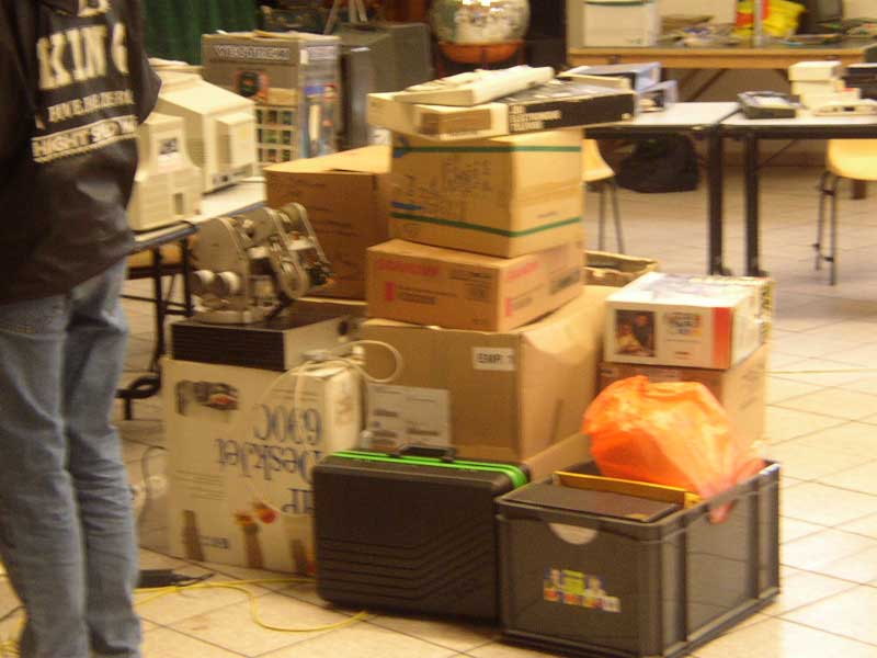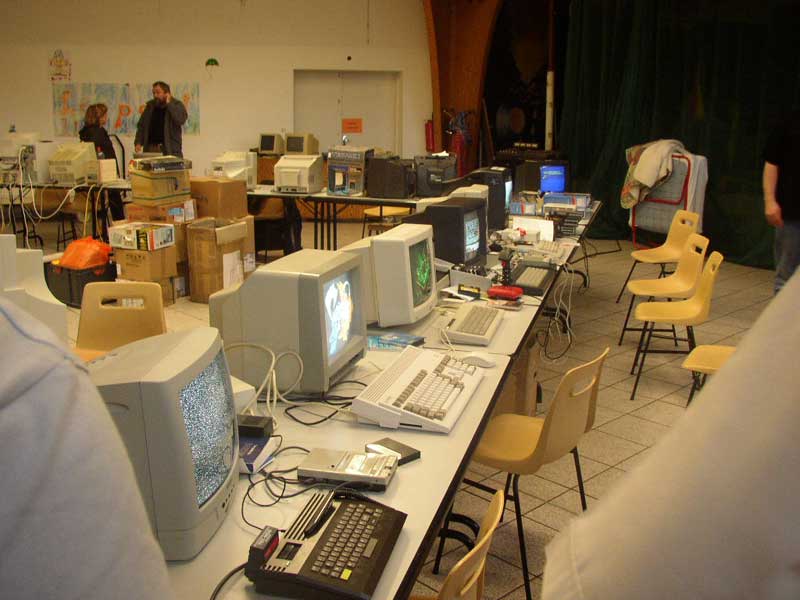 Atari Falcon et ST, Amiga, Vectrex, Plus en boite, GX4000, Amstrad PPC, Atari Stacy (miam!), Commodore C64 (trans)portable, un Sony MSX, des consoles de jeux à ne savoir qu’en faire. Uboot ramena une vingtaine de bécanes au final et il fallu un chariot pour tout faire entrer/sortir de la salle.