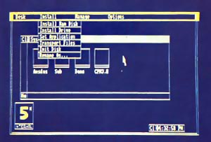 La plus grosse nouveauté c’est le subsystem. Il s’agit d’un gestionnaire de bureau (un peu à l’instar du Mac ou de l’Atari ST). Ainsi, à l’allumage de la bécane, il suffit de taper SYSTEM pour que le bureau s’affiche. En haut, un menu déroulant avec Desk, Install, Manage, Options. Tout en bas à gauche, une icône désignant un 5 pour indiquer que le lecteur 5″1/4 est bien connecté.