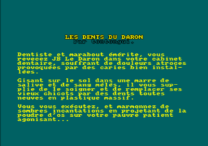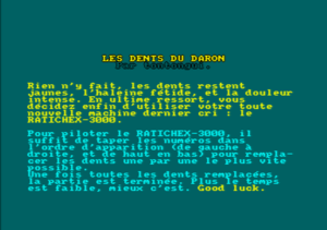 Vous le dentiste et marabout émérite, devez soigner les dents de JB Le Daron. Il y a du travail sur la planche car les caries ne datent pas d’hier. Mais avec votre tout nouveau machin truc dernier cri le « RATICHEX-3000 » qui remplace les vieux chicots par du plastique massif, rien n’est impossible. Pour le piloter, il suffit de taper les numéros dans l’ordre de lecture le plus rapidement possible.
