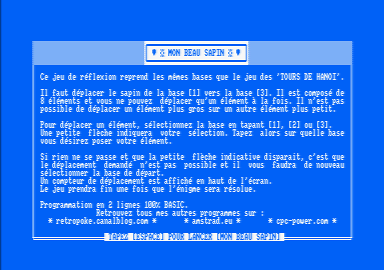 1 DEF FNp$(x)=SPACE$(8-x)+STRING$(x*2-1,&E1+x):MODE 2:FOR a=1 TO 8:a(a,1)=9-a:LOCATE 8,a+7:PRINT FNp$(a):NEXT:a(0,1)=8:PRINT”TAPEZ”,1,,2,,3:WHILE a(8,3)=0:z=1:WHILE z:s=0:WHILE s<1 OR s>3 OR a(0,s)=0:s=VAL(INKEY$):WEND:x=a(0,s):d=0:WHILE d=s OR d<1 OR d>3