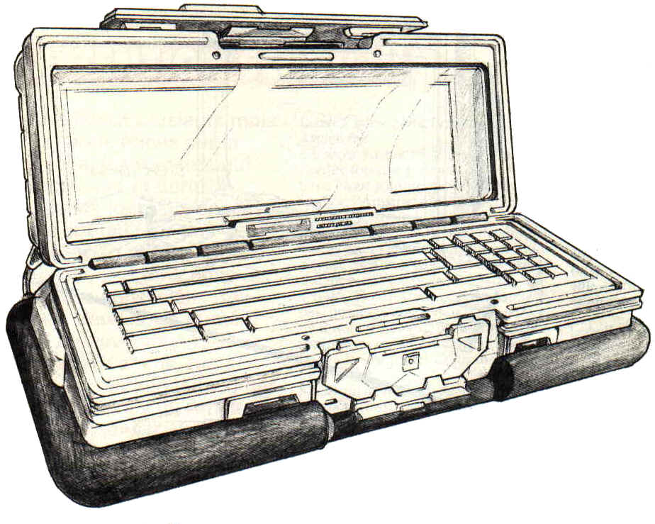 Comme le modèle portable, un moniteur LCD se rabat sur l’unité centrale. Il est relié à cette dernière par un câble non amovible totalement étanche. Présence de joints plastique tout autour de l’unité centrale. Le clavier est recouvert d’une membrane plastique. Incroyable : la machine est entourée de boudins en caoutchouc et devrait donc pouvoir flotter. L’écran est doublé d’une plaque de plexiglas. Il serait à prévoir une alimentation par panneaux solaires amovibles.