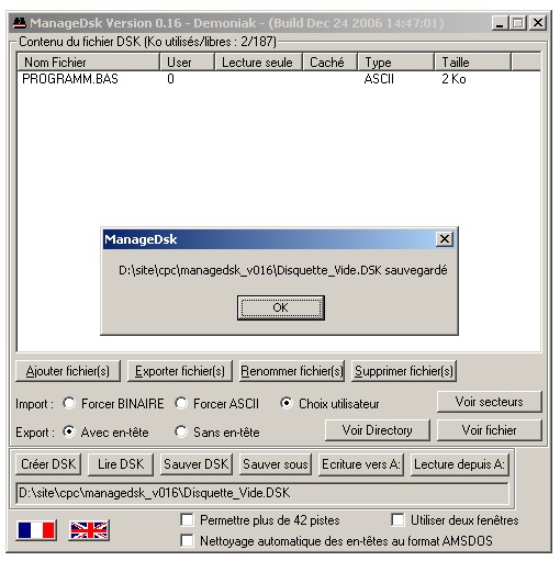 Je vais vous montrer ici comment ajouter un listing dans un fichier .dsk avec managedsk, un utilitaire très pratique réalisé par Demoniak. La manip est assez simple, voici les différentes étapes.