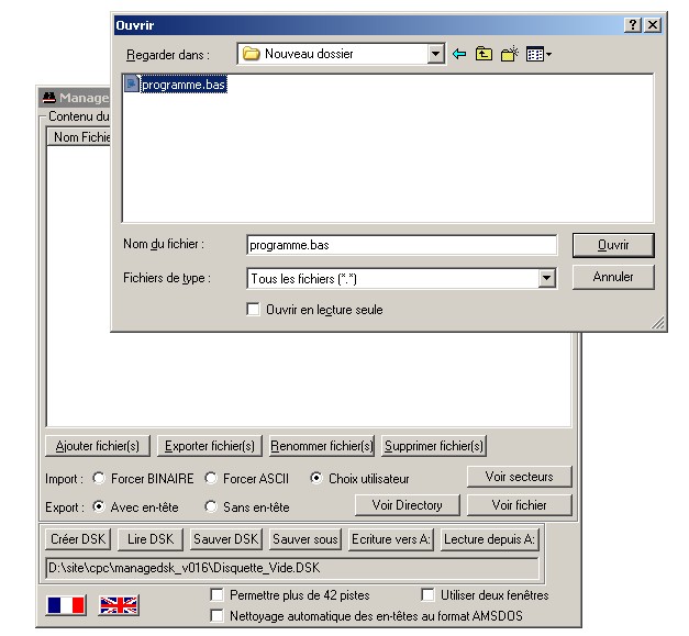 Je vais vous montrer ici comment ajouter un listing dans un fichier .dsk avec managedsk, un utilitaire très pratique réalisé par Demoniak. La manip est assez simple, voici les différentes étapes.