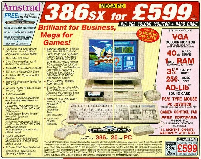 Il intègre une carte Mega Drive sur un slot ISA interne, ce qui permet d’utiliser à la fois le système PC et la console. Un écran à double synchronisation (dual-sync) permet d’afficher les modes PC (VGA) et Mega Drive (15 kHz via SCART). Il était livré avec périphériques complets : moniteur, clavier, souris, manette de jeu Mega Drive et joystick PC. Il utilisait MS-DOS 5.0 avec une interface Amstrad Desktop comme système d’exploitation pour la partie PC. La console Mega Drive n’était pas accessible simultanément avec l’ordinateur : on basculait d’un mode à l’autre grâce à un capot coulissant à l’avant du boîtier qui permettait d’insérer la cartouche ou d’utiliser le lecteur de disquette.