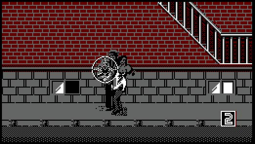 *La version dont je dispose a été châtrée du screen de planque de la version originale .C’est là qu’on y voyait notre héros accroupi, le pistolet risible à la main, derrière son muret portatif.