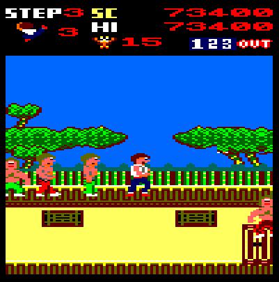 Le but du jeu justement : pour progresser vous devez éliminer une vingtaine de méchants, leur nombre s’affichant en haut de l’écran avec les scores, les vies restantes et le niveau actuel de blessure. Une fois les méchants éliminés, une autre vague arrive avec un boss si on peut l’appeler ainsi, c’est à dire un gars (ou une fille) beaucoup plus costaud que les autres. Tous les vilains éliminés, vous passerez au niveau suivant et ainsi de suite.