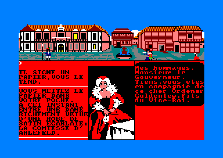 Première difficulté à résoudre. De retour dans la ville, je cherche, en me baladant, comment obtenir ce maudit papier. Le palais du gouverneur, voilà la solution. D’une pression du doigt sur le pavé numérique, me voici dans le bureau du gouverneur. Que dire à ce personnage si important ? Tiens, il me connaît. Cela va diablement faciliter les choses. Muni du parchemin, je retourne à la forteresse, où un vieil homme me demande de récupérer une cassette dans laquelle se trouve des documents qui peuvent le sauver. Je reprends ma visite de la ville. A l’est, toujours à l’est. La cathédrale, puis le spladgest (la morgue, quoi). J’entre, il fait sombre mais je distingue un personnage bien étrange. Il se présente et me raconte l’histoire du cadavre qui gît à ses côtés.
