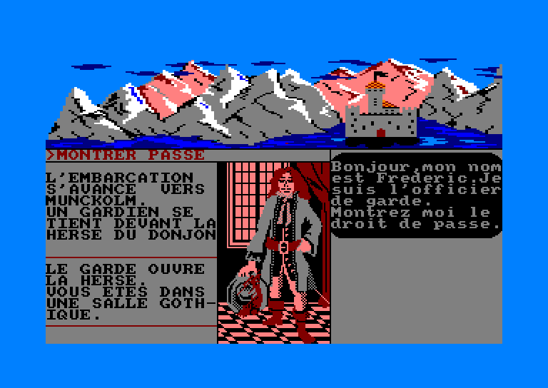 Il faut absolument que je rencontre ces deux monstres, si bien gardés. Comment pourrais-je me rendre à la forteresse ? D’une touche de curseur je vais au port, où un pêcheur me propose d’embarquer. La promenade en mer est de courte durée. Je me trouve maintenant face à un imposant portail, là un garde me demande mon laissez-passer.