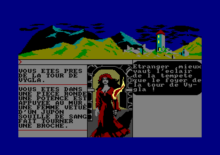 “Seigneur, cet homme a été assassiné par Han d’Islande, je pourrais vous conduire auprès de ce dernier. Malheureusement, je manque d’argent “. Toujours d’un doigt, je lui jette une petite bourse bien remplie. Alors, il m’entraîne hors de la ville, sur la route de Skongen. Après plusieurs touches de curseur( heu, quelques heures de marche), un orage éclate. Malgré la peur de mon guide, je décide d’entrer dans une tour, qui semble habitée. A notre suite, deux personnages s’y introduisent. Quelques temps plus tard, l’hôte de ces lieux apparaît, tandis que mon guide affolé, me glisse à l’oreille : “c’est le bourreau”.